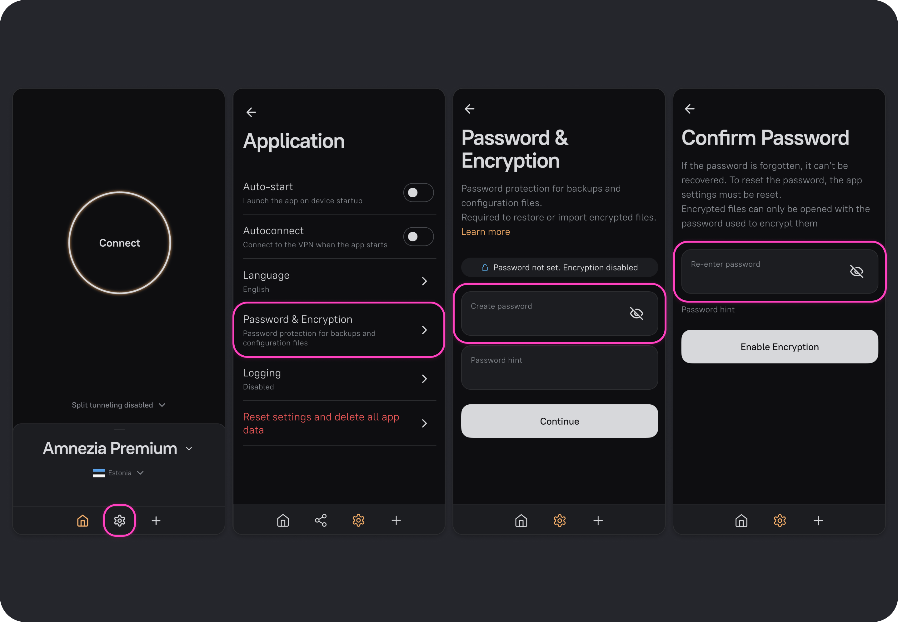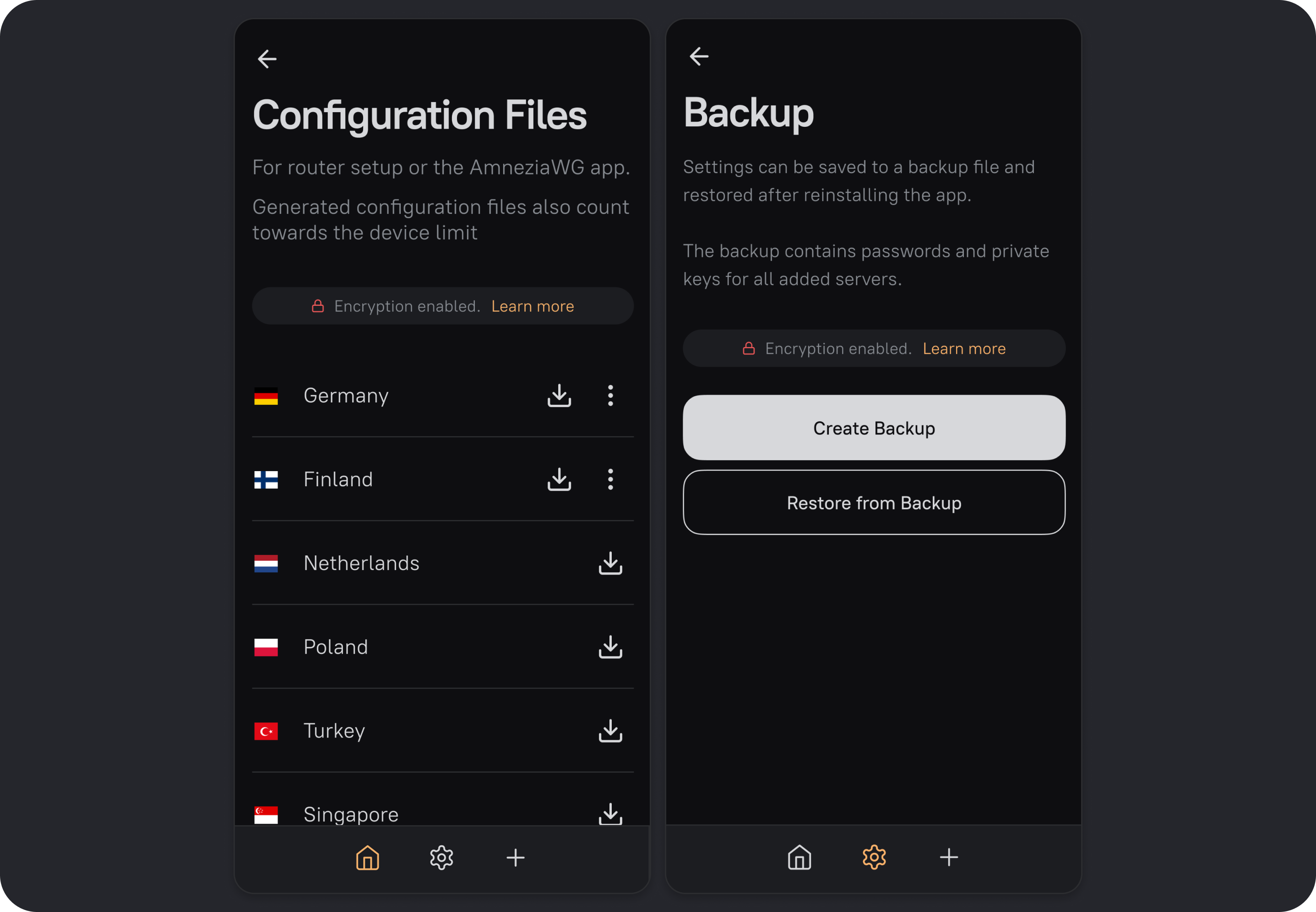 Password & Encryption is a feature in AmneziaVPN that encrypts files created in the app and saved to your device: