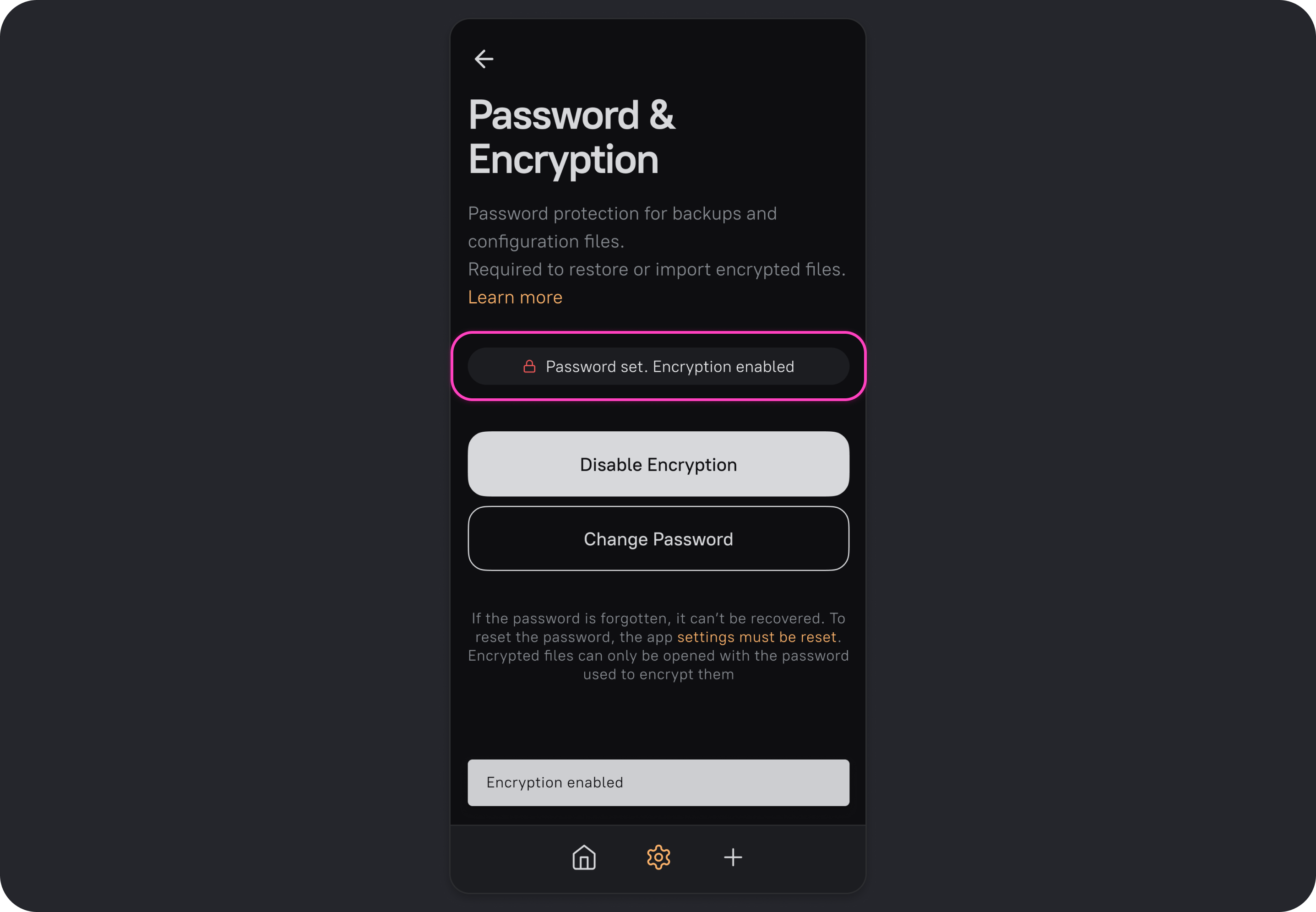 After you enable encryption, every configuration and backup file you save/export from the app will be encrypted. Files saved before encryption was enabled will remain unchanged.
