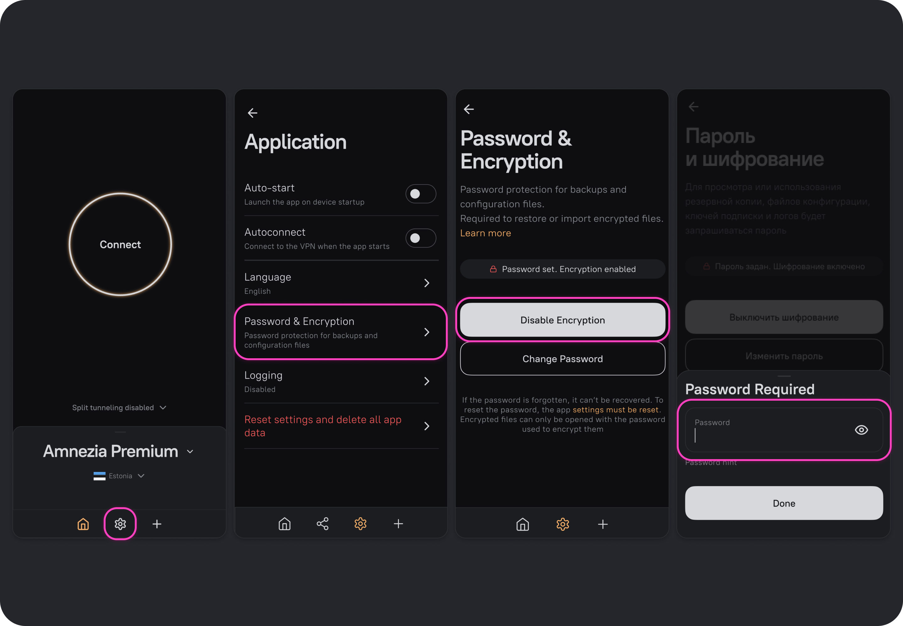 If you forgot the password, you won’t be able to access the contents of encrypted files. To disable encryption, you’ll need to reset all settings and delete all app data — this option is in AmneziaVPN settings under Application.