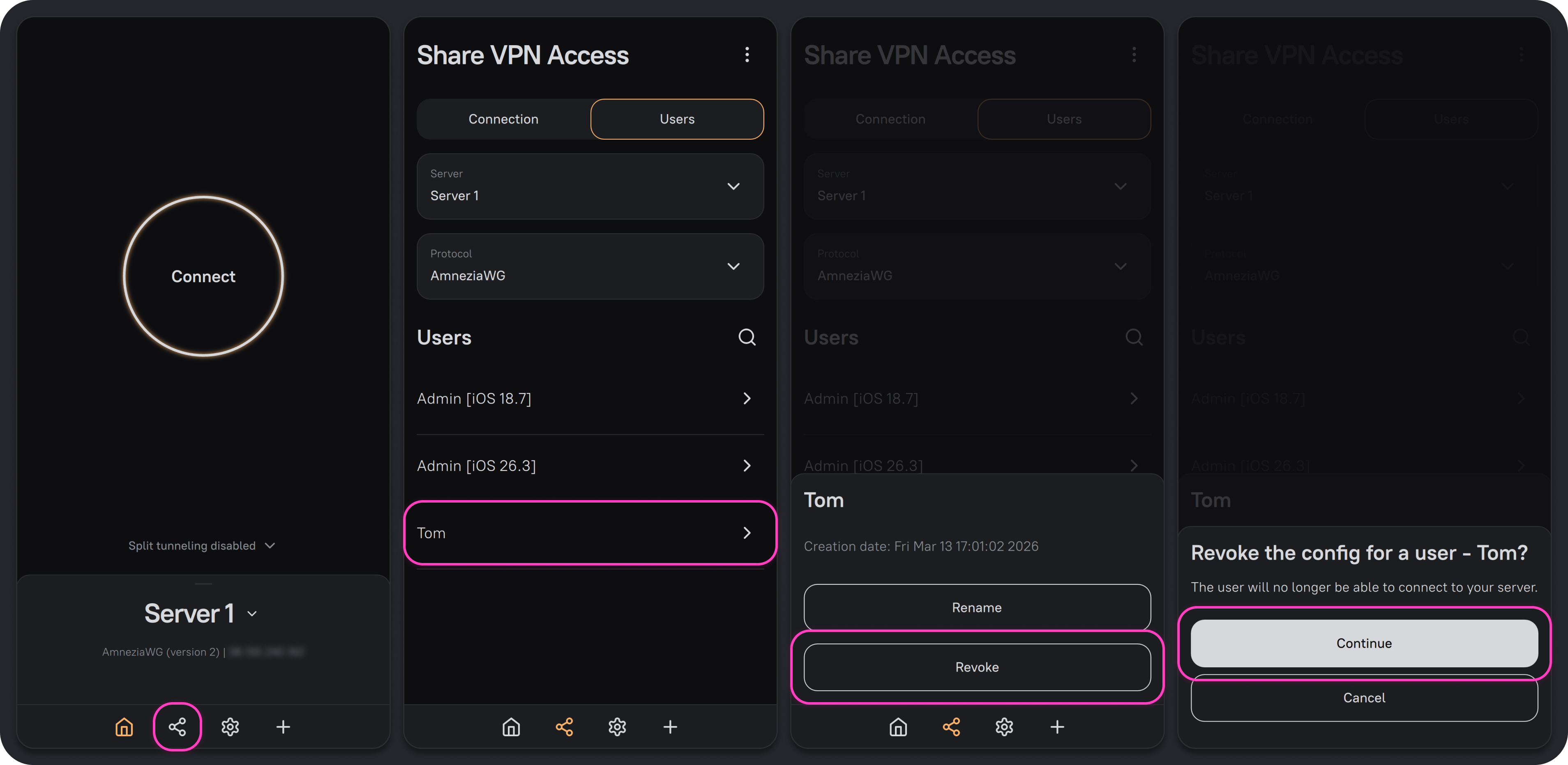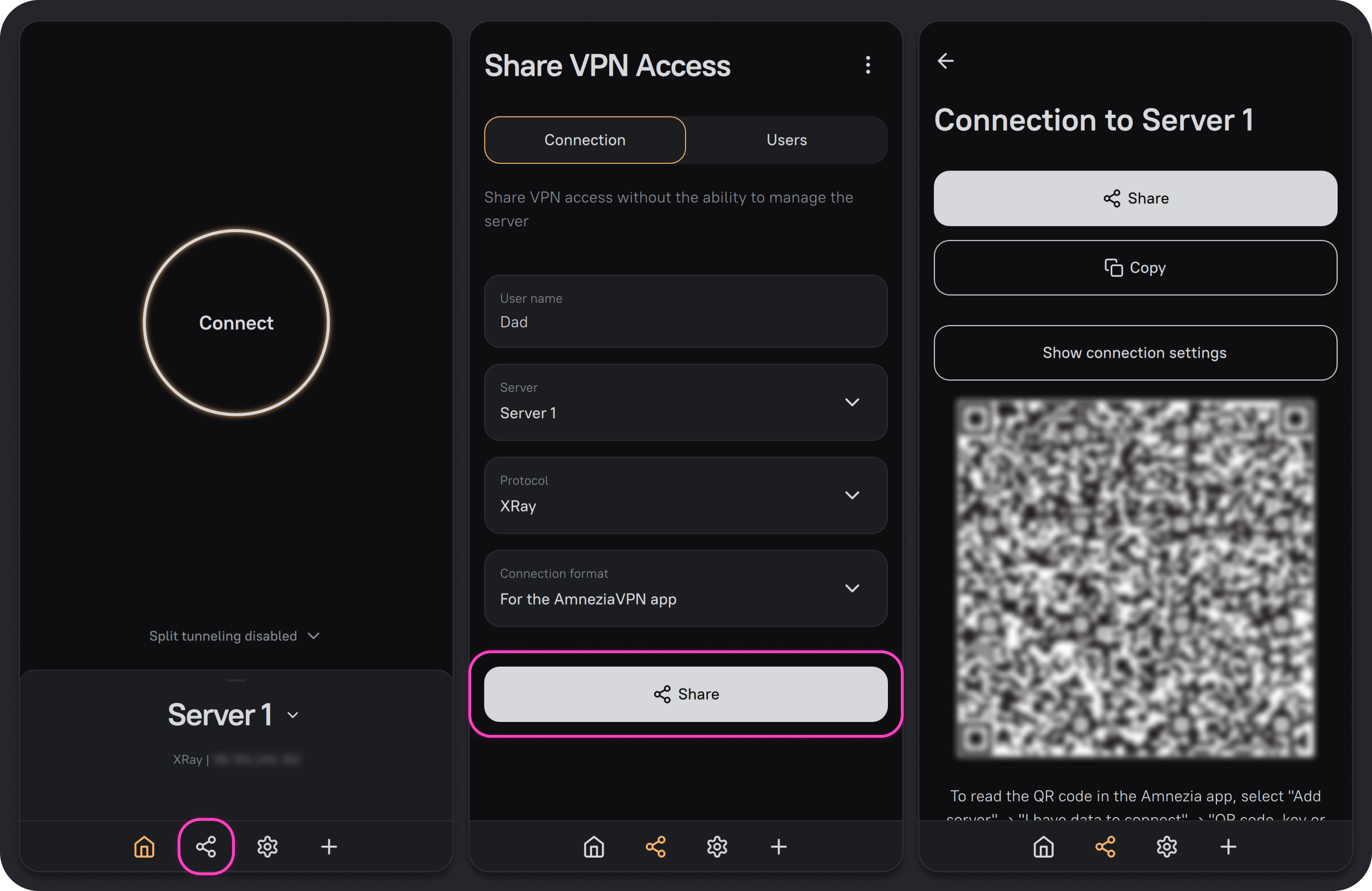 - Open the AmneziaVPN app with an existing full access connection to the server, then click the Share icon on the bottom bar to the left of the gear icon.