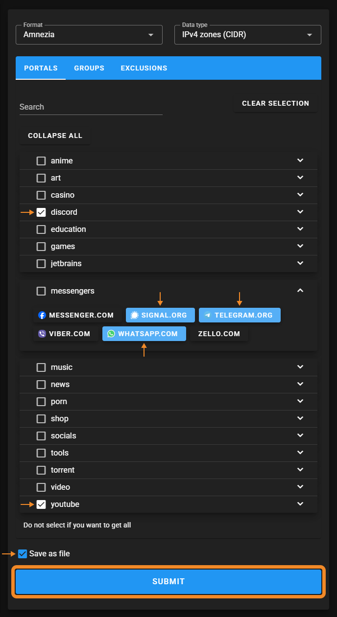 - Go to https://iplist.opencck.org → choose format Amnezia and data type IPv4 addresses.