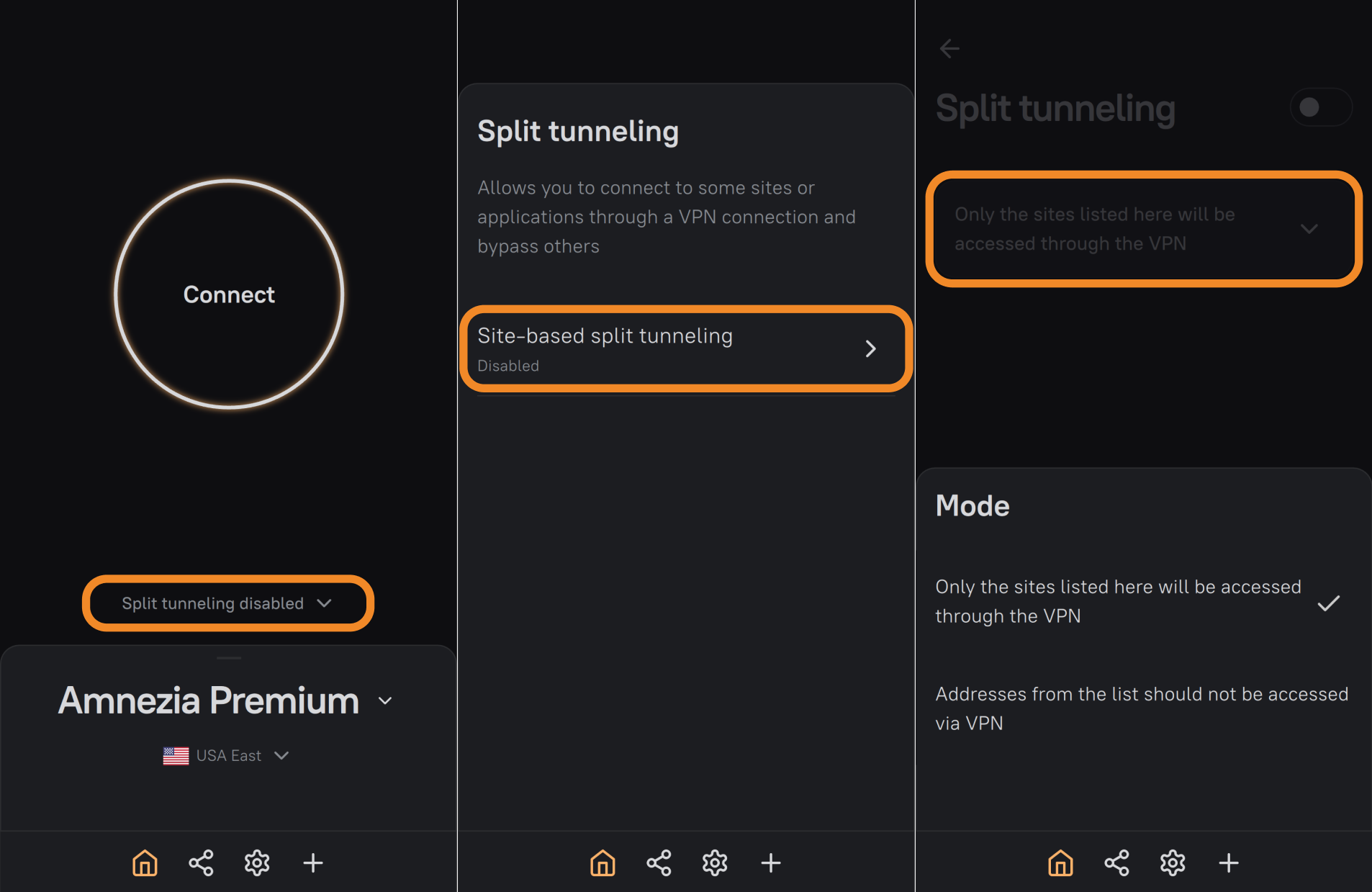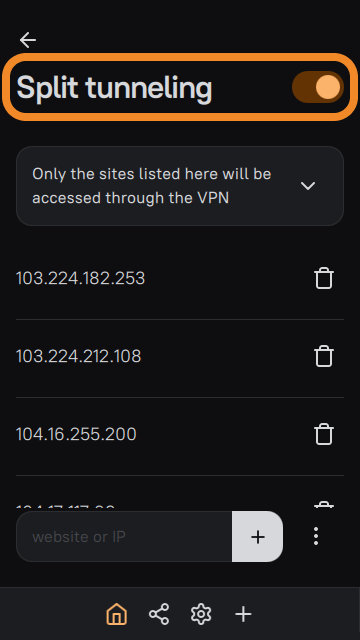 - Open split tunneling settings for sites (IPs) in AmneziaVPN and select Only the sites listed here will be accessed through the VPN.