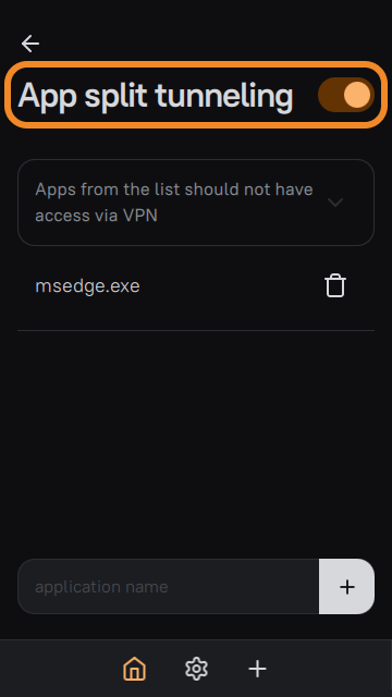 In Windows, AmneziaVPN supports a single app split mode in which only apps from your list work without VPN. The opposite mode — "only apps from the list work through VPN" — is available in AmneziaVPN on Android and is not available on Windows.