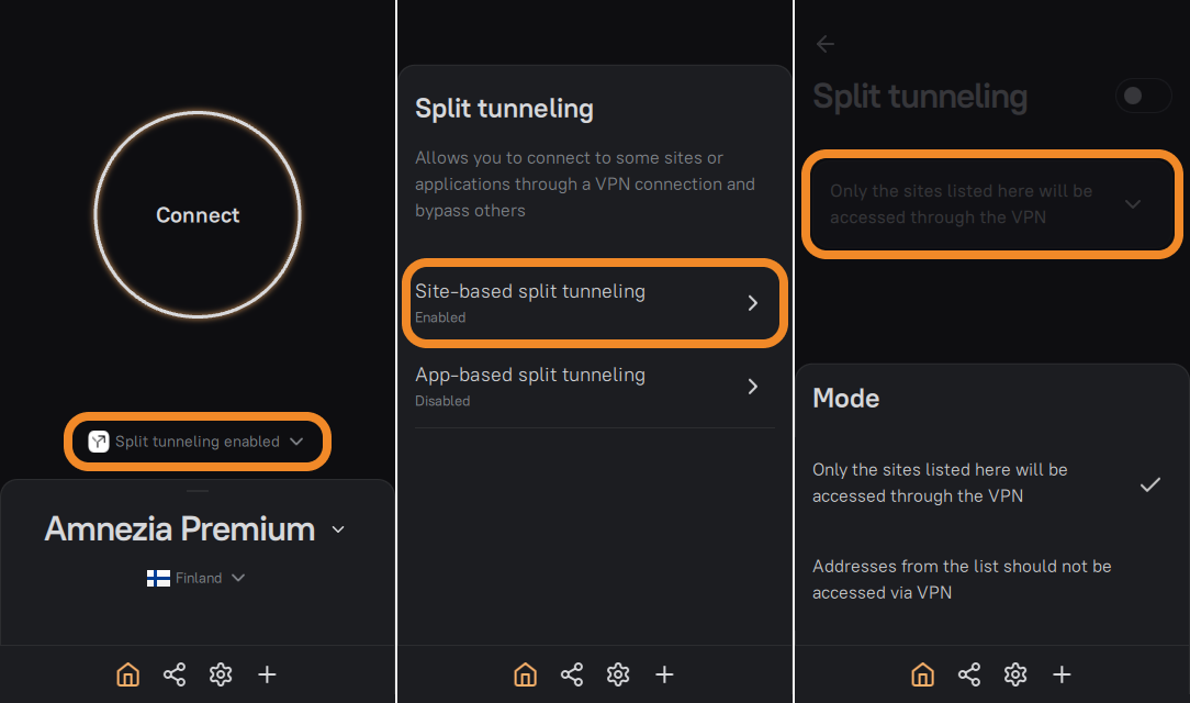- In AmneziaVPN open split tunneling for sites and select Only the sites listed here will be accessed through the VPN.