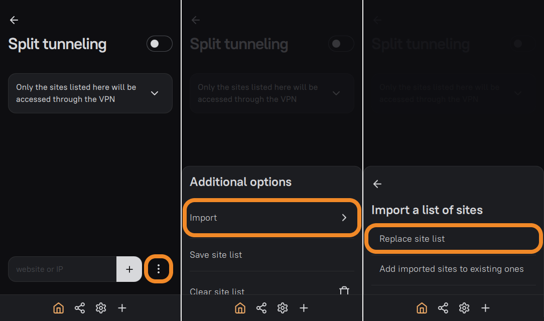 - Click ⋮ (three dots) and choose how to import (Replace site list or Add imported sites to existing ones).