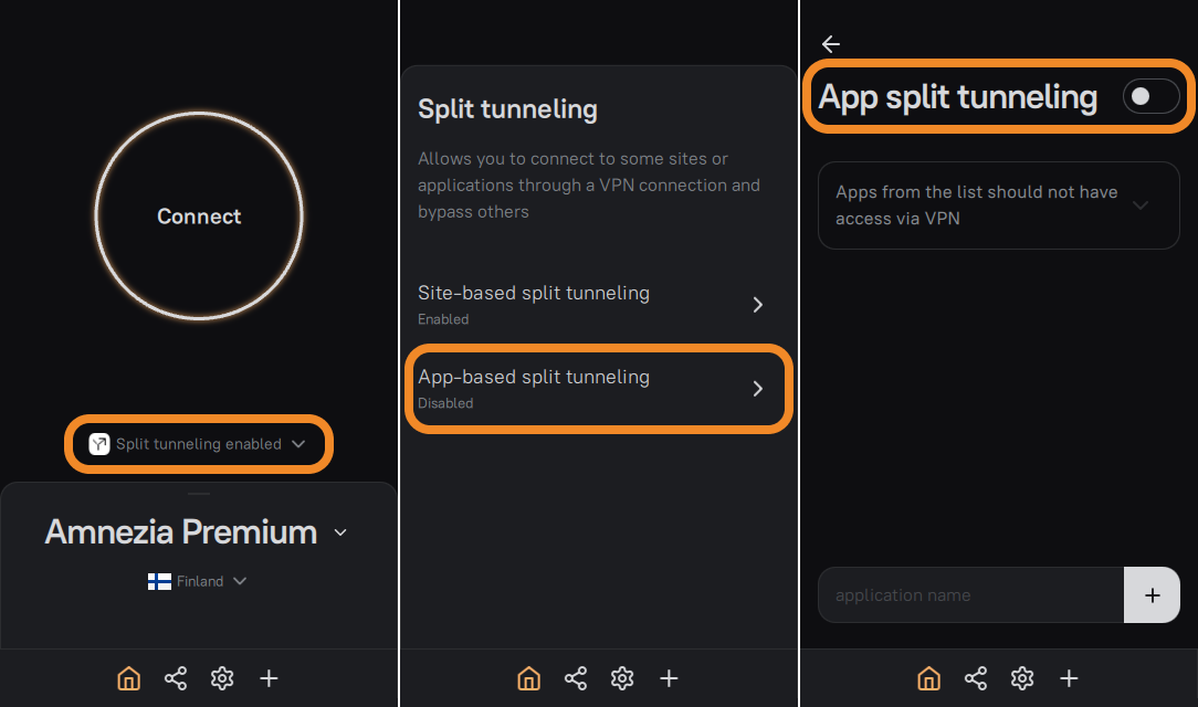 Split tunneling is an AmneziaVPN feature that lets you choose IP addresses/subnets and apps that should either use the VPN tunnel or bypass it.