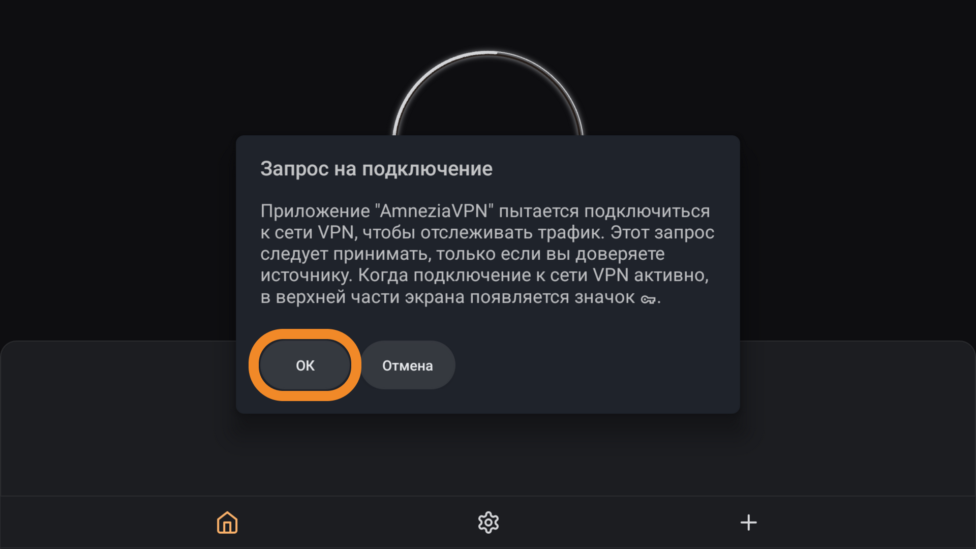 При первом подключении в AmneziaVPN система запросит разрешение на создание приложением VPN-подключений — нажмите OK.