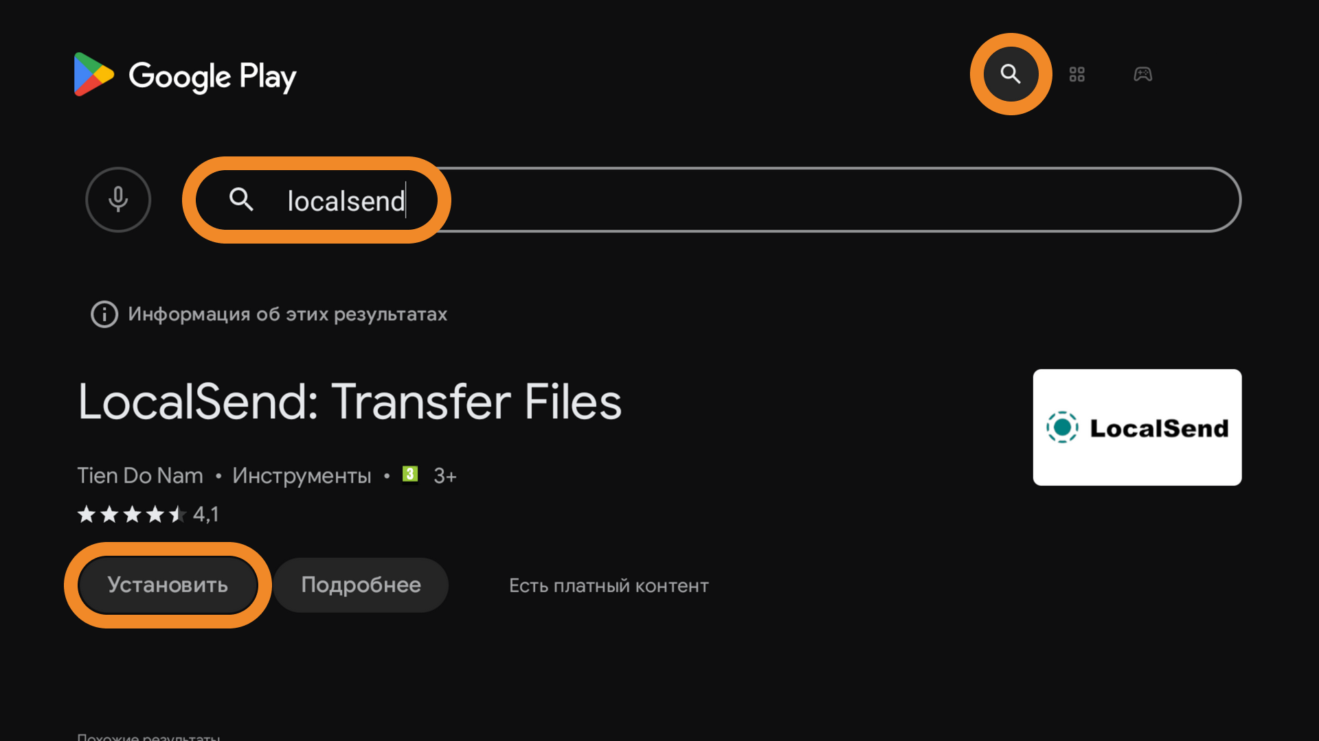 - Найдите через поиск приложение LocalSend и установите его.