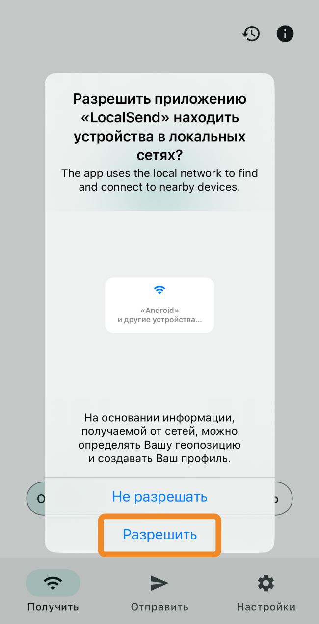 - Откройте приложение LocalSend. Если система запросит разрешение на доступ к локальной сети, предоставьте его, иначе вы не сможете передать данные на Android TV.