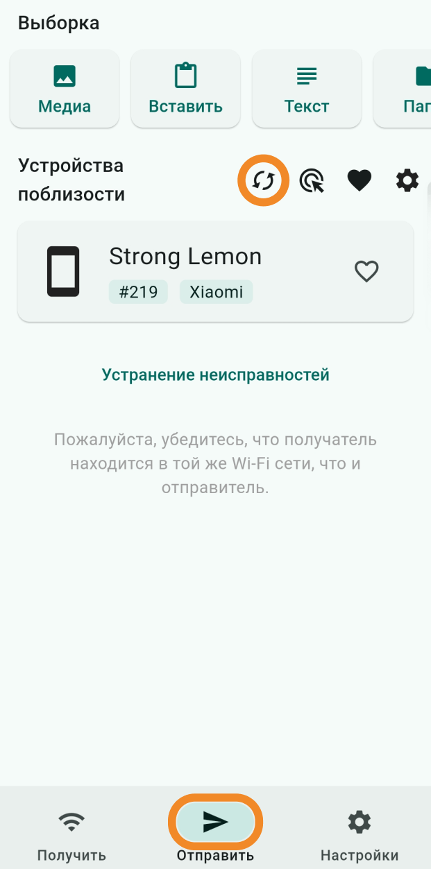 Убедитесь, что случайное имя в приложении LocalSend на Android TV совпадает с именем, которое вы сейчас видите на втором устройстве в списке доступных поблизости.