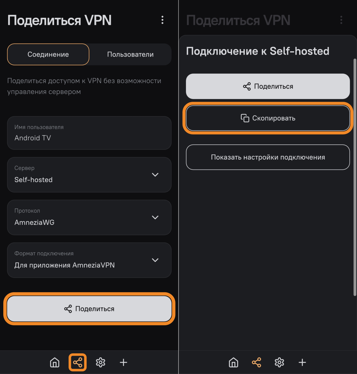- Откройте приложение AmneziaVPN на втором устройстве, перейдите в раздел Поделиться VPN (вторая иконка в нижней панели приложения) и нажмите кнопку Поделиться.