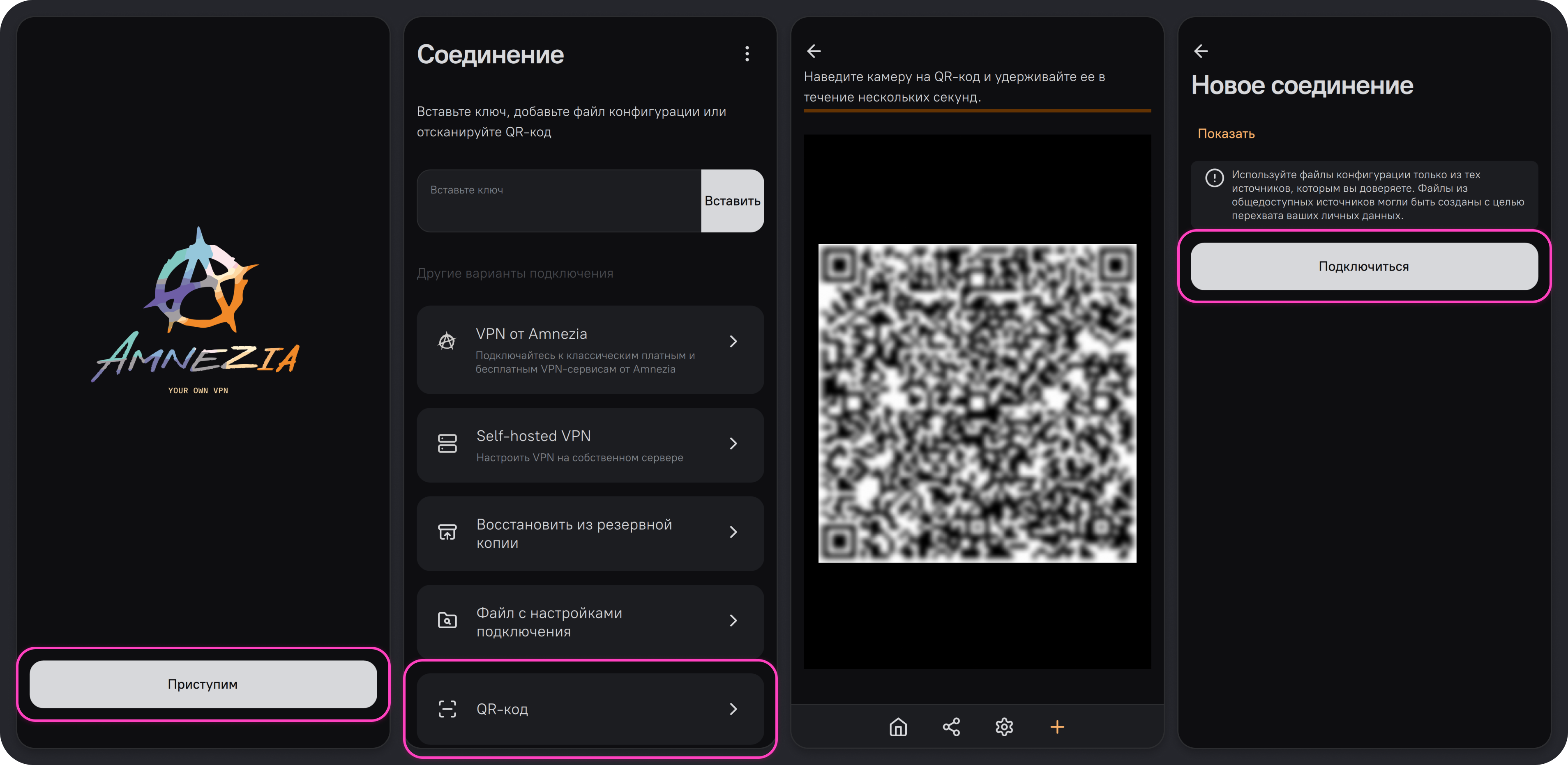 В приложении AmneziaVPN есть несколько способов создания подключения: