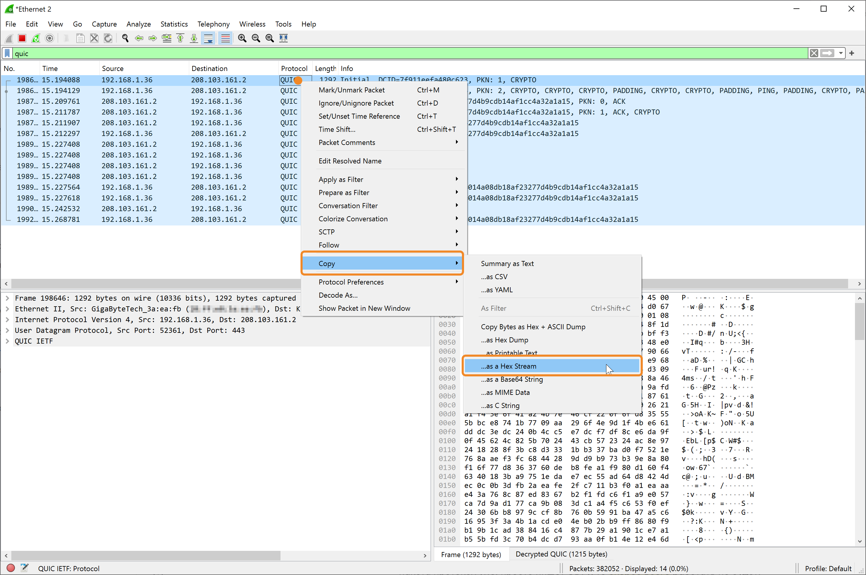 Рассмотрим процесс поиска сигнатуры на примере популярного UDP-протокола QUIC: