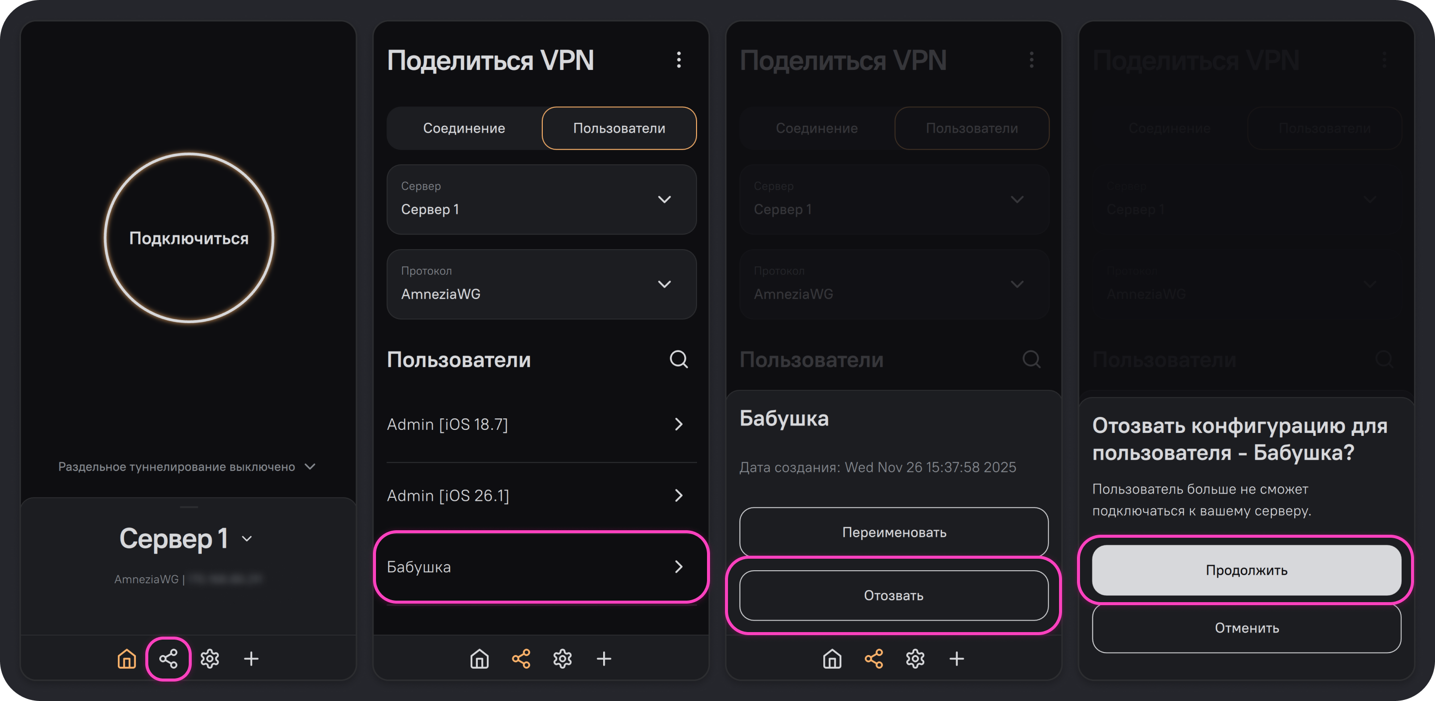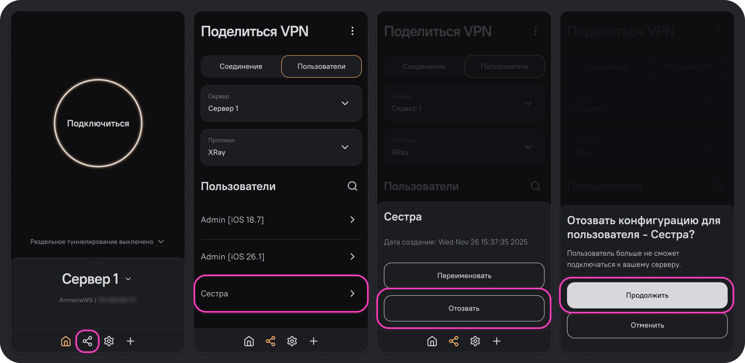 Если вы настроили на сервере VPN с помощью приложения AmneziaVPN, поделиться можно полным или гостевым доступом к VPN, которые имеют между собой крайне важные отличия. В приложении AmneziaVPN эти опции называются Поделиться полным доступом к серверу и VPN и Поделиться VPN — далее в этой инструкции мы будем называть их просто полным и гостевым доступом.