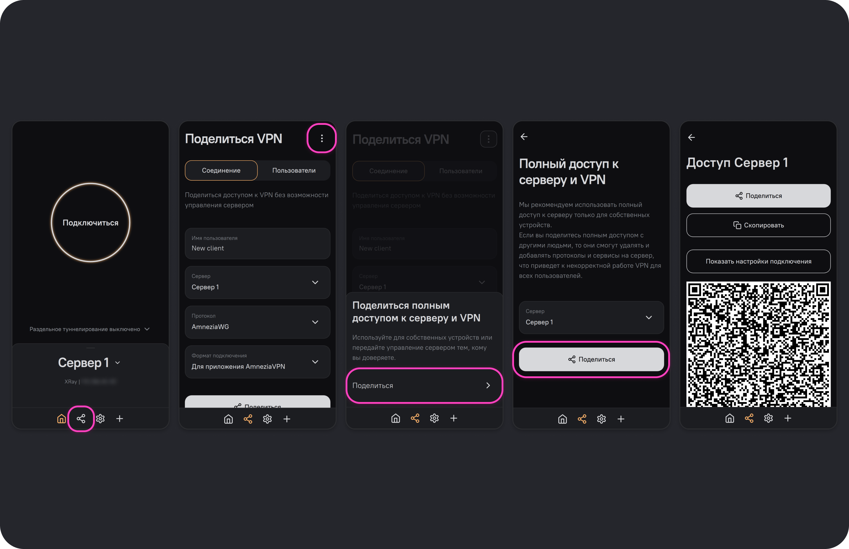 Если вы настроили на сервере VPN с помощью приложения AmneziaVPN, поделиться можно полным или гостевым доступом к VPN, которые имеют между собой крайне важные отличия. В приложении AmneziaVPN эти опции называются Поделиться пол ным доступом к серверу и VPN и Поделиться VPN — далее в этой инструкции мы будем называть их просто полным и гостевым доступом.