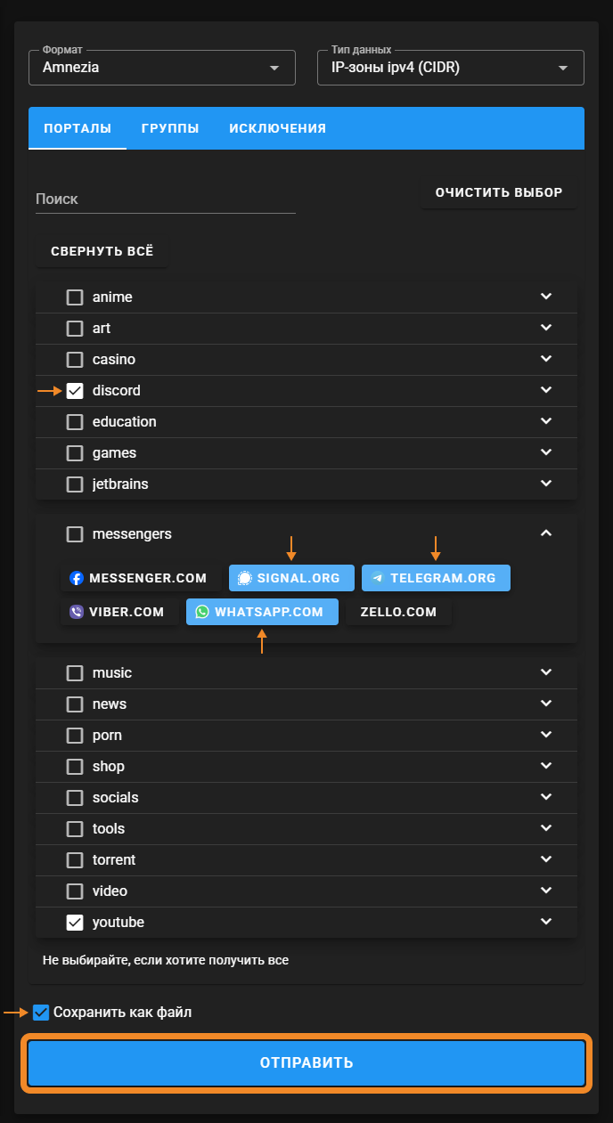 1. Перейдите на сайт https://iplist.opencck.org/ru → выберите формат Amnezia и тип данных IP-зоны IPv4 (CIDR).
