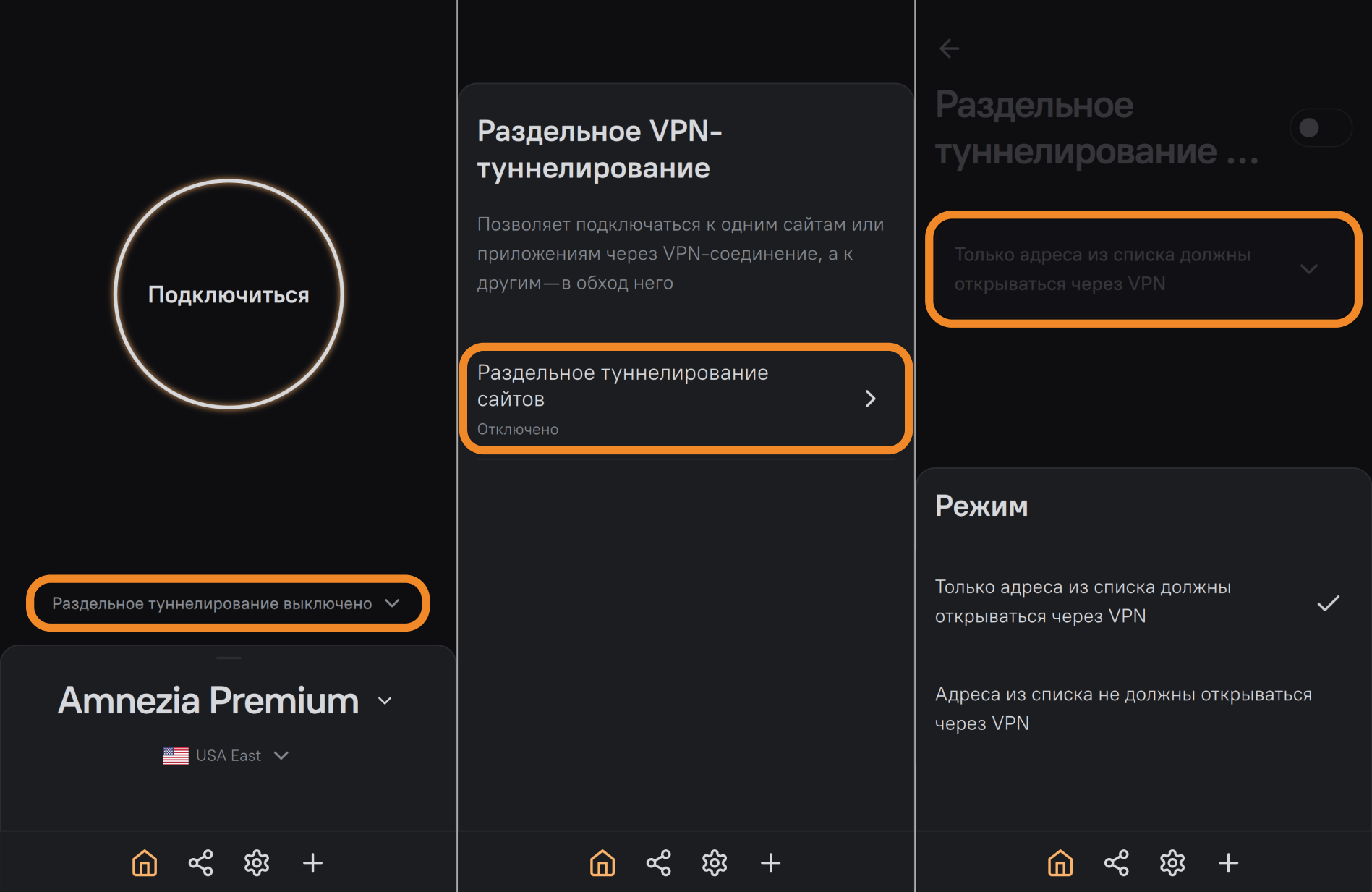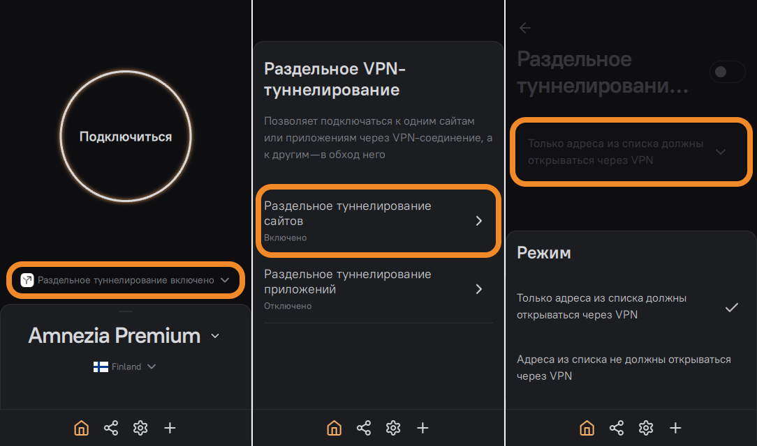 1. Зайдите в параметры раздельного туннелирования сайтов в AmneziaVPN и выберите вариант Только адреса из списка должны открываться через VPN.