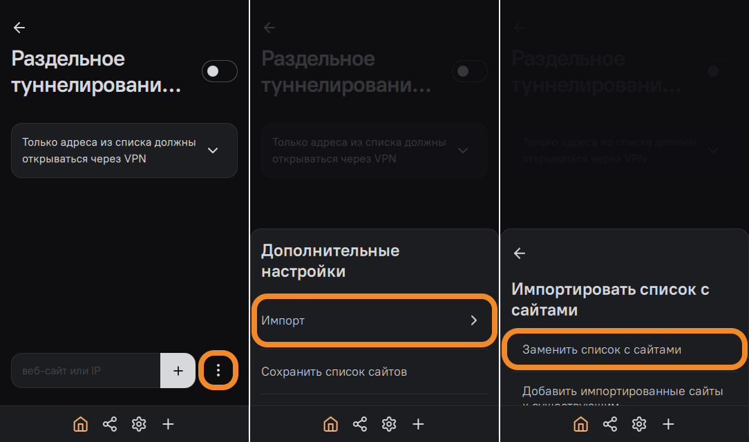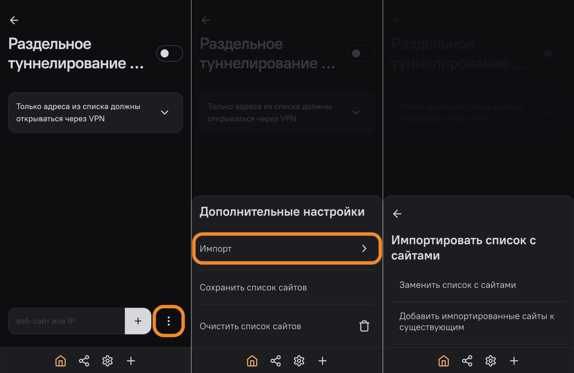 1. Нажмите на значок (три точки) и выберите предпочтительный способ импорта (Добавить импортированные сайты к существующим или Заменить список с сайтами).