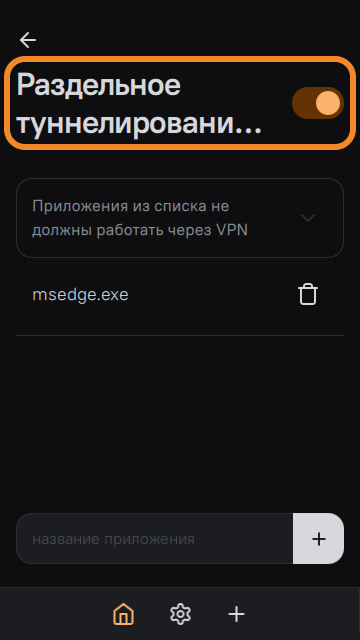 1. Зайдите в параметры раздельного туннелирования приложений и нажмите кнопку ➕ (плюс).
