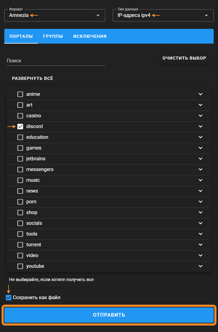 1. Перейдите на сайт https://iplist.opencck.org/ru → выберите формат Amnezia и тип данных IP-адреса IPv4.
